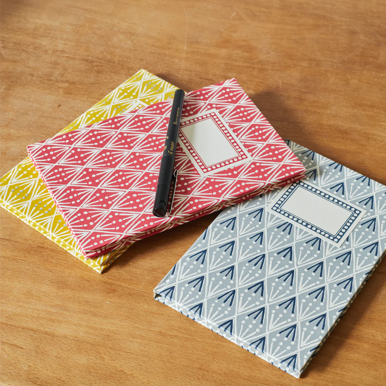 Cambridge Imprint Hardback Notebooks are inspired by the slim patterned German Insel-Bücherei books of the inter-war period. (In The United Kingdom, King Penguins had a similar design, and later on Ladybird books shared the same format.) They have 80 pages of plain cream paper, sewn properly and bound into a slim, light hardback notebook, covered in our patterned paper, that opens completely flat.